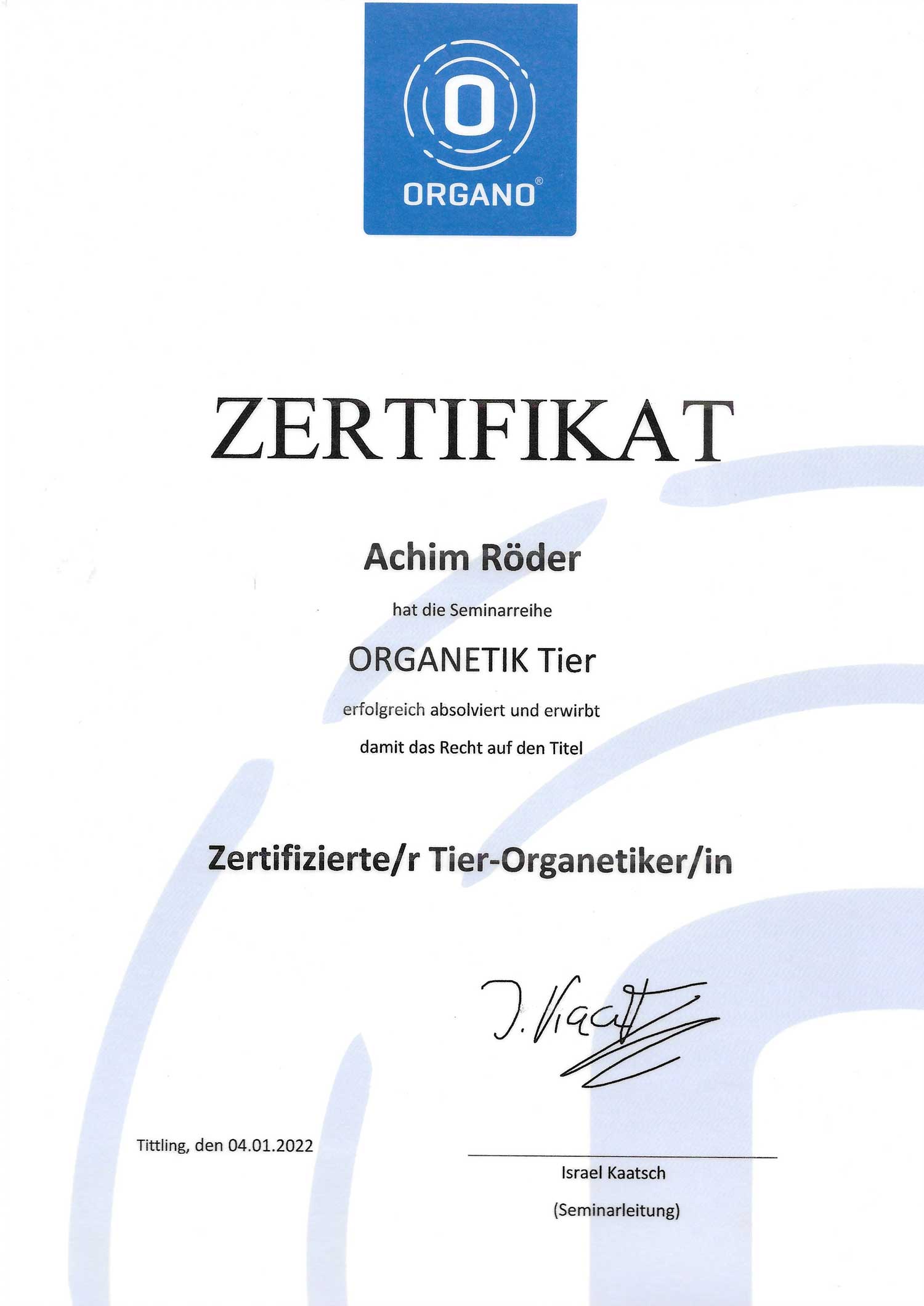 - 2020: Zertifizierter Tier-Organetiker