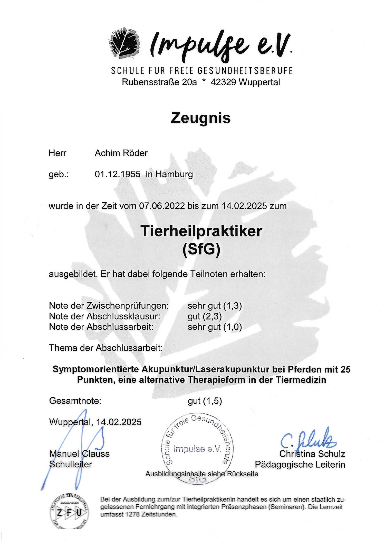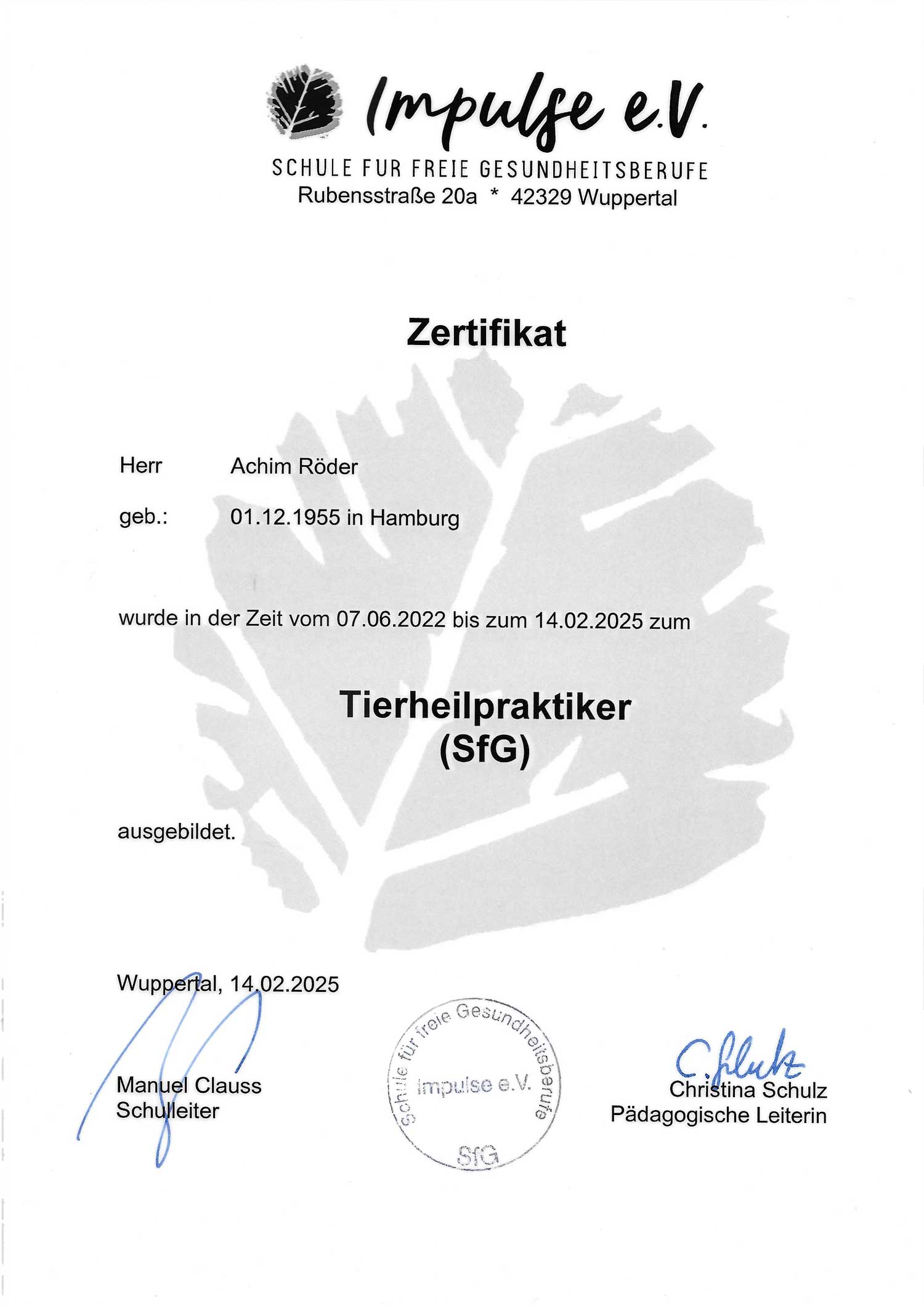 - 2023–2025: Ausbildung zum Tierheilpraktiker